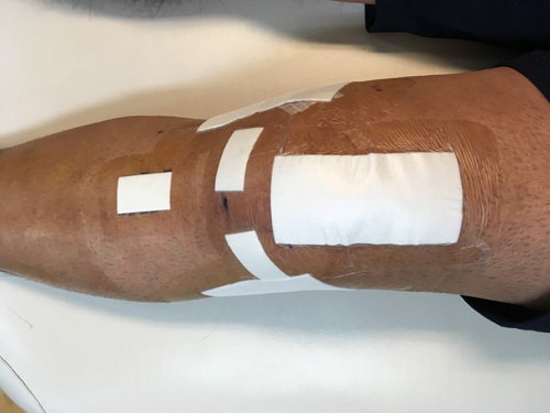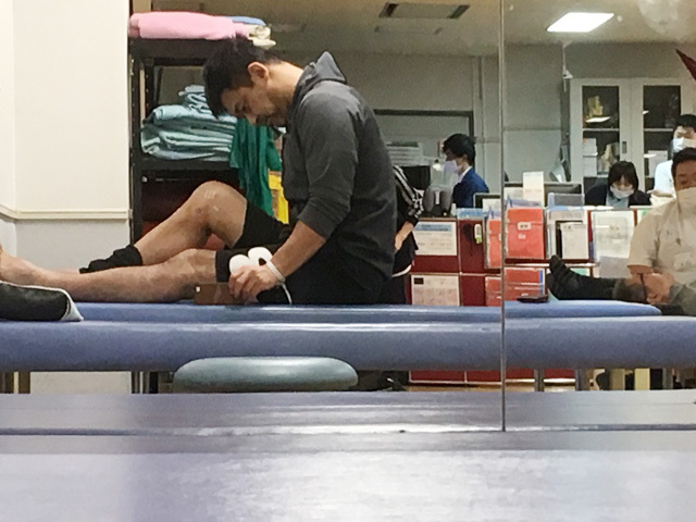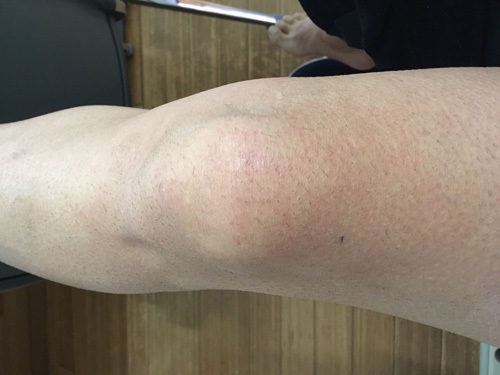 包帯の下の腫れ上がった足です。膝の3箇所に内視鏡の穴を開け、他にも5箇所切開する大手術。術後、麻酔が切れてもそれほど痛みはなかったのですが、とにかく痺れがひどく、ずっと正座のあとのような痺れが続きました。