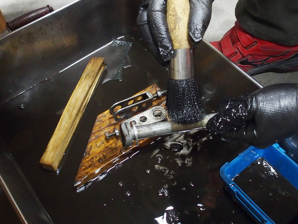 チェーンアジャスター・アクスルシャフトなど取り外したパーツは全て洗浄しちゃいましょう。古いグリスやこびりついたダストなどきれいに洗い落とします!