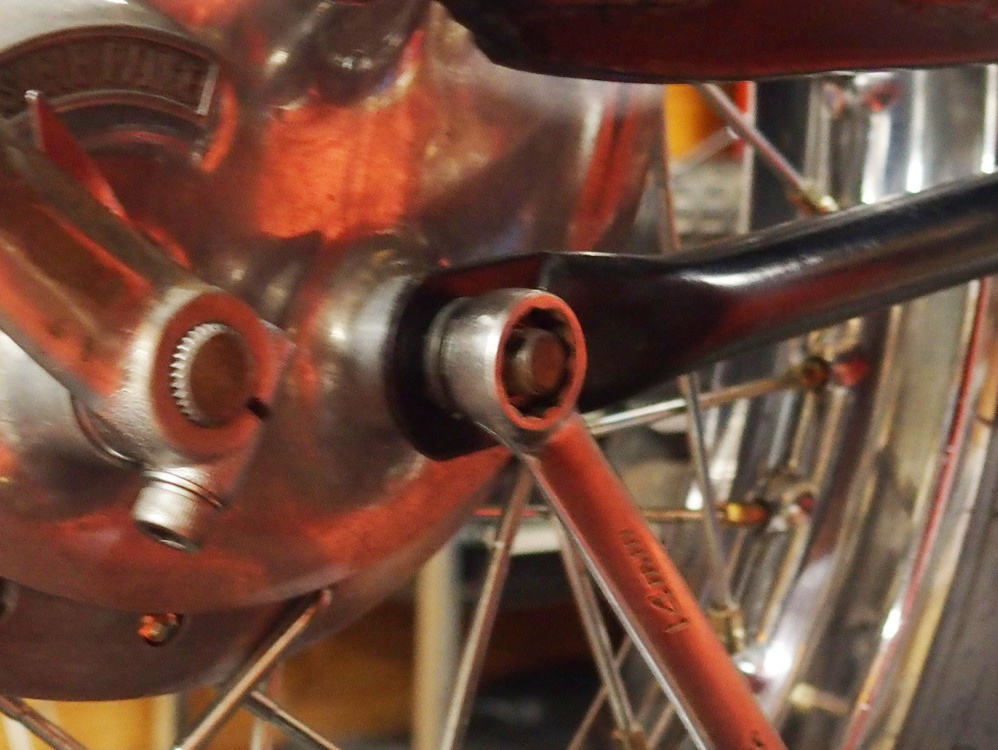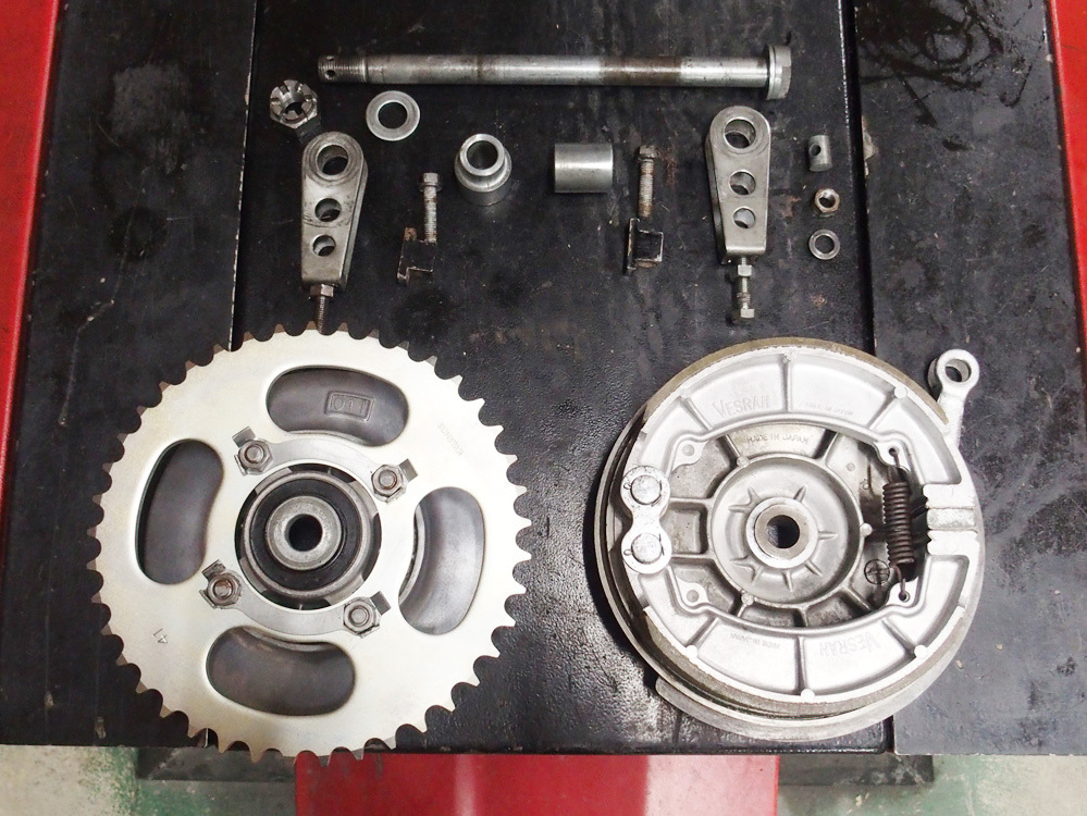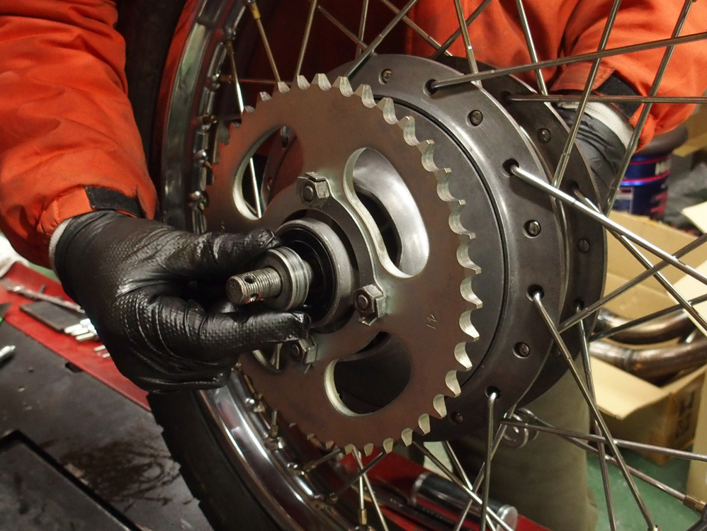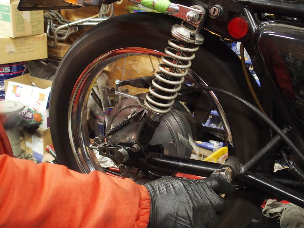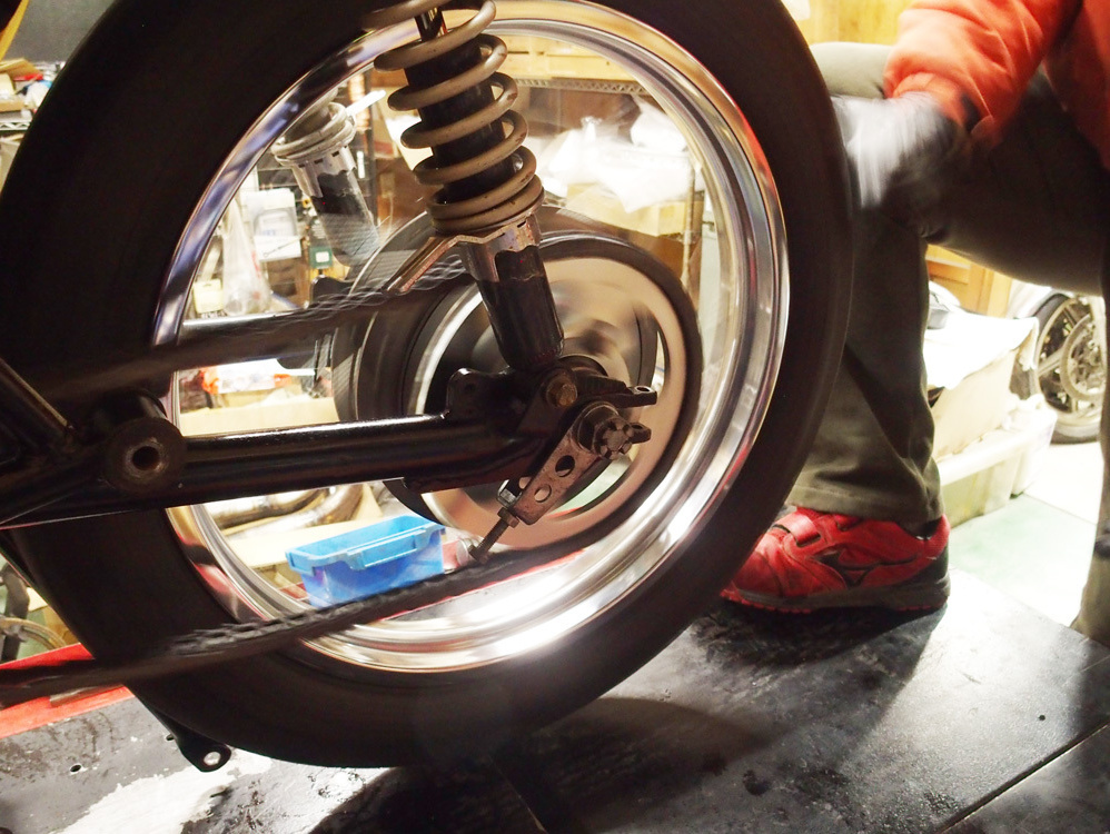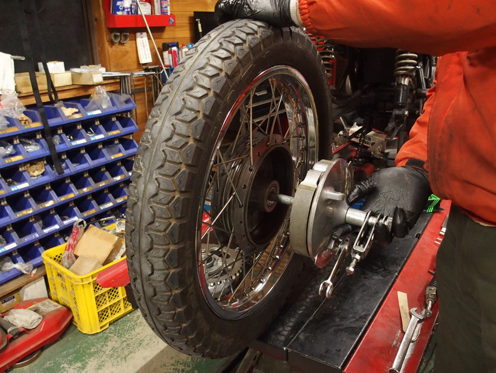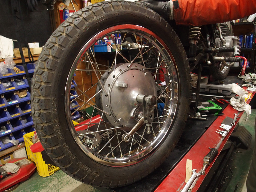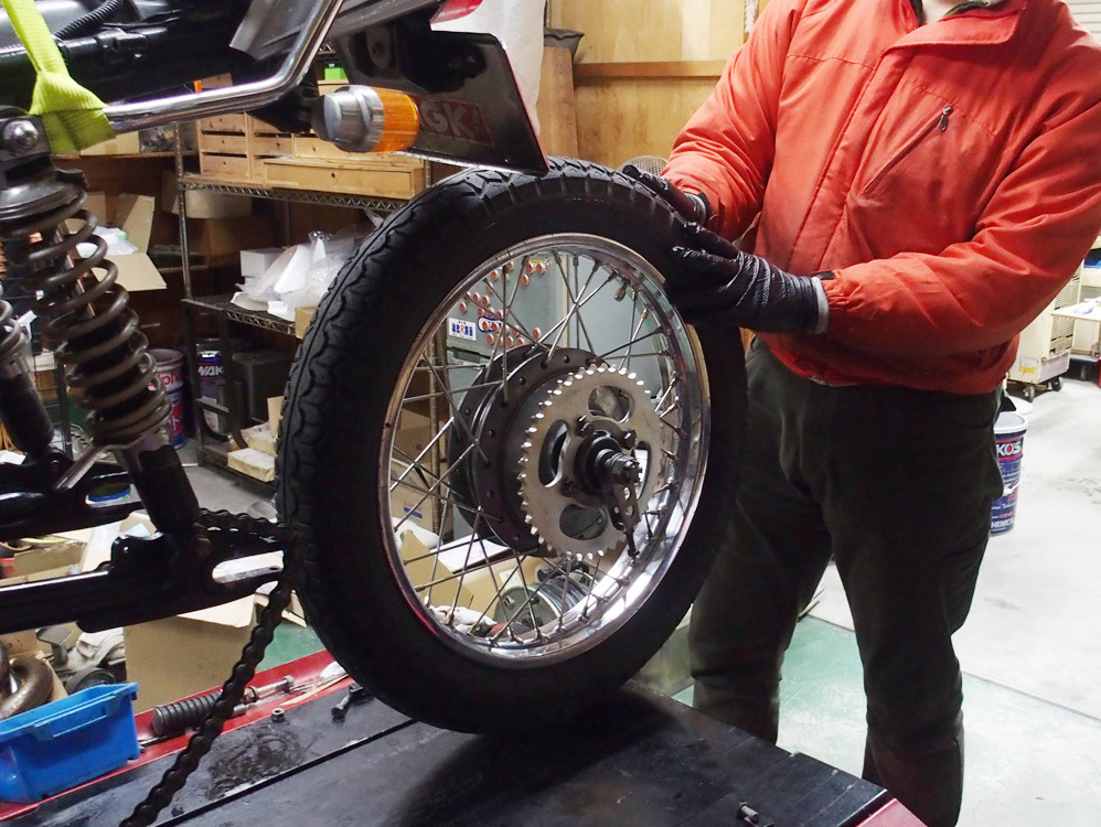 シリーズでお送りしてきましたリアホイール周りのメンテンナンスもとうとう最後になりました。スポークの張り替え・リアスプロケット交換・ブレーキシュー交換とメンテンナンス&クリーニングを施していよいよタイヤの装着です。リアホイールには駆動と制動の部分が絡んでいますので、装着後の調整が非常に重要になります。ぜひ参考にして下さい。