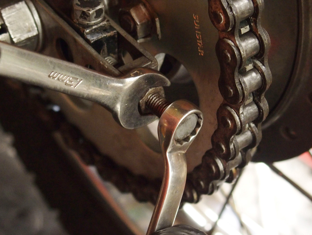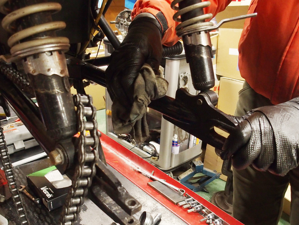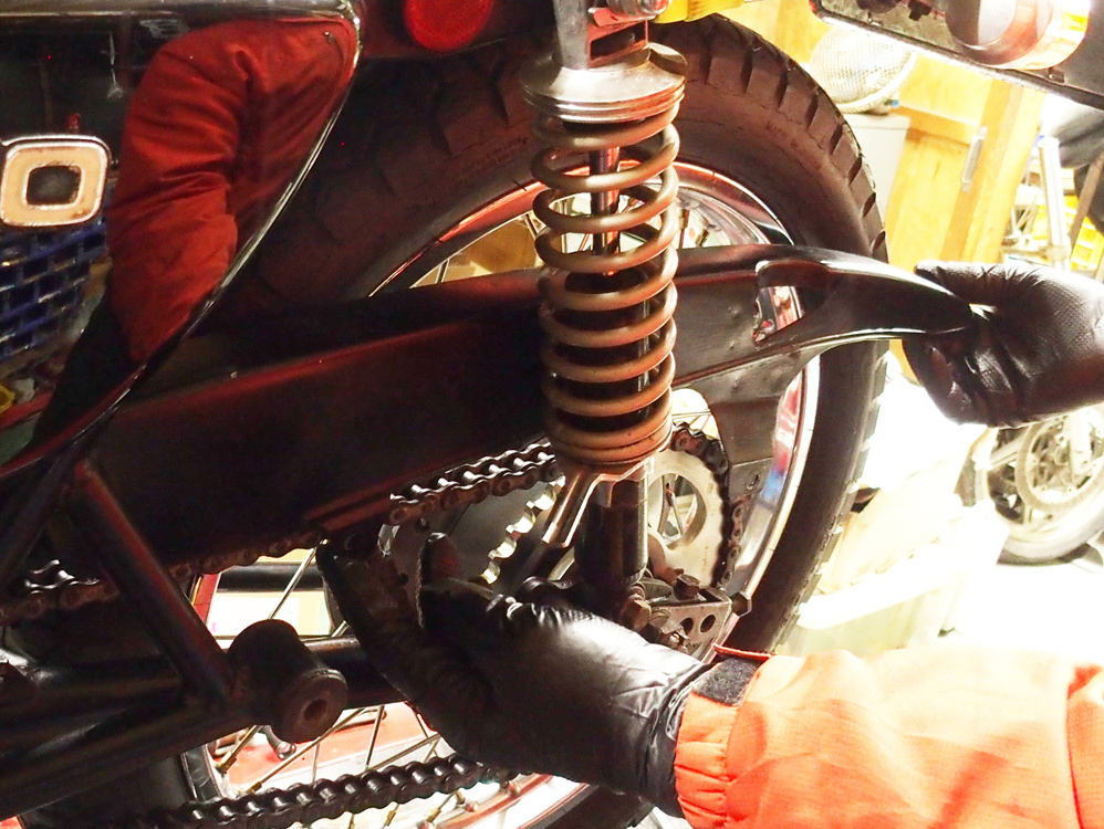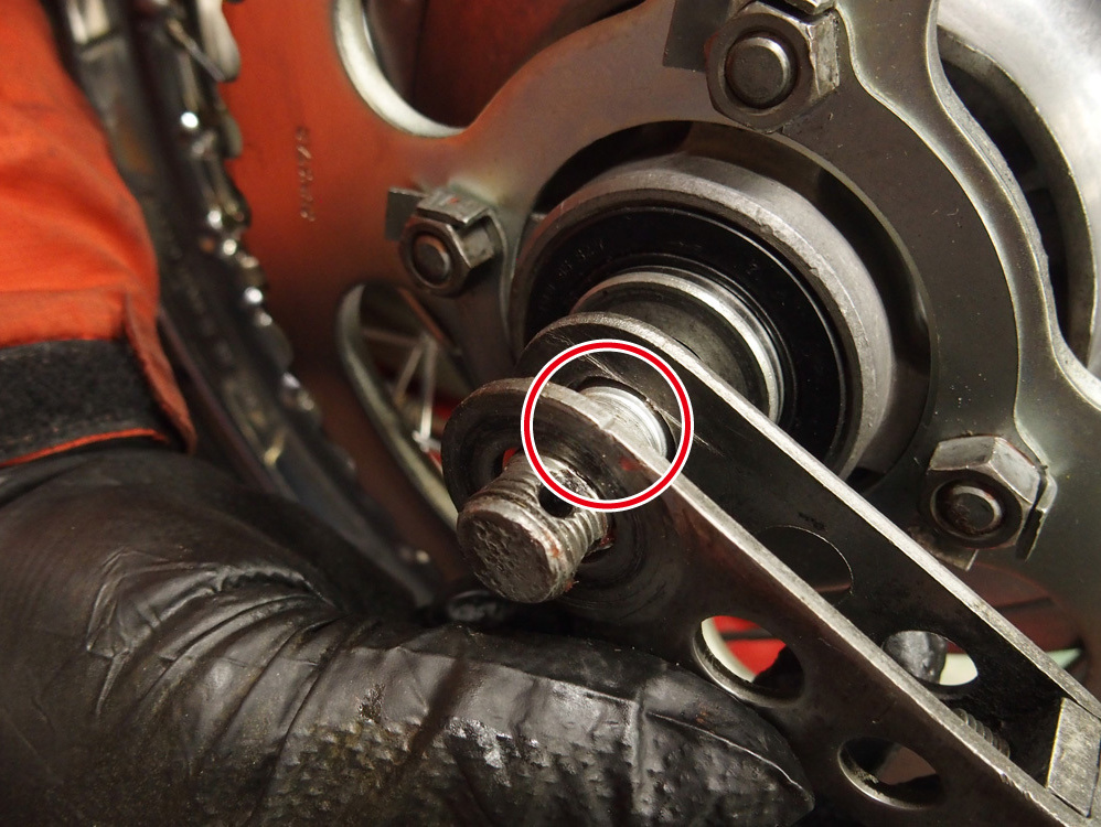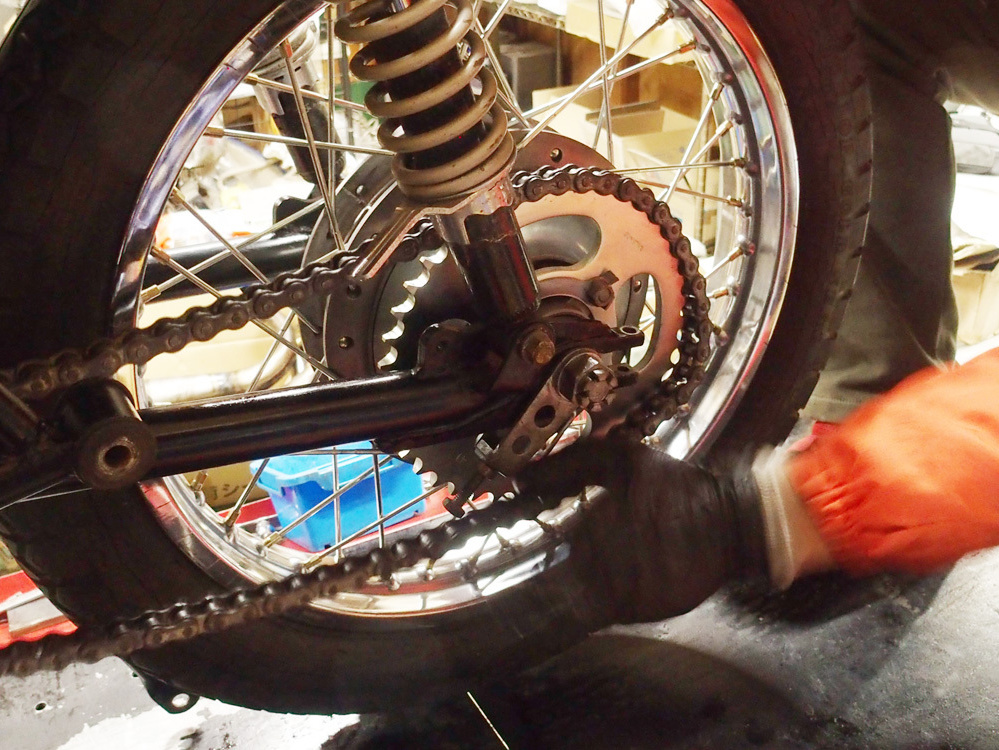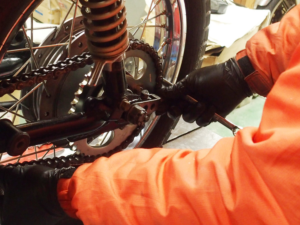 また、リアアクスルナットを締め込んでからのチェーンの張りを必ずチェックして下さい。エンジンミッション内のベアリングを破損する恐れがあるので、チェーンの張り過ぎには注意!