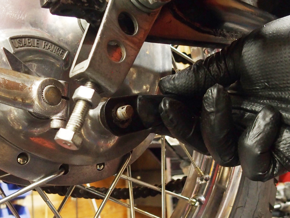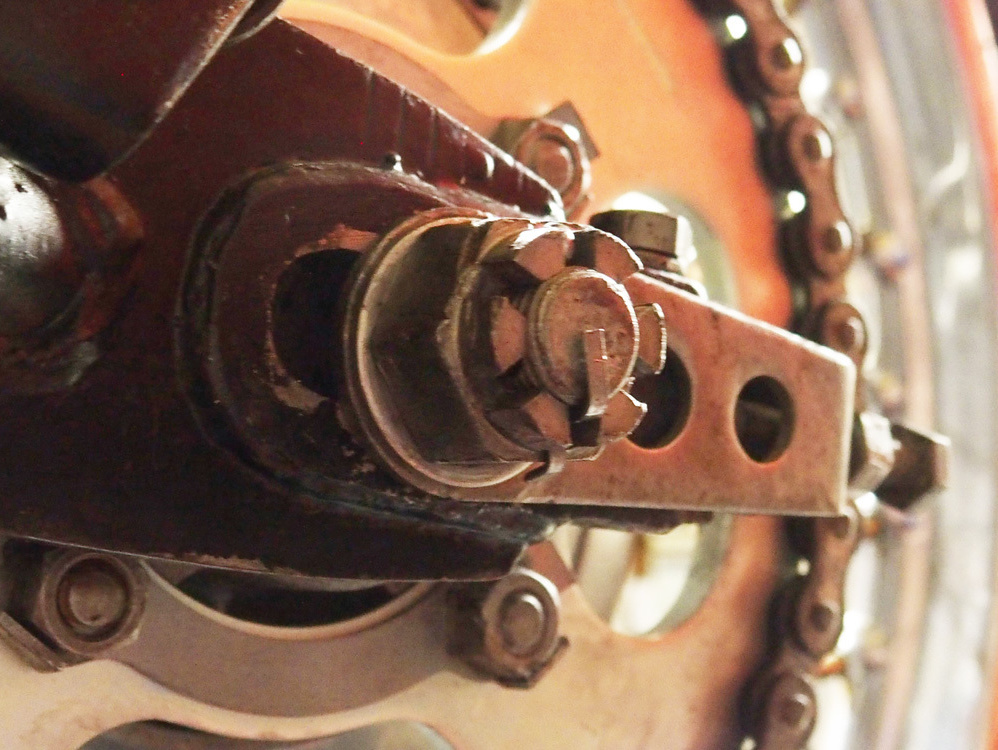チェーン調整はチェーンアジャスターに付いている、チェーンアジャストボルトで行います。