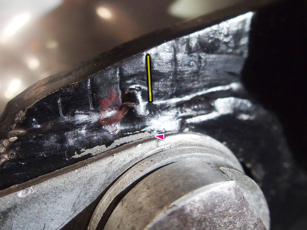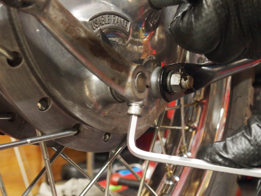 まずはブレーキシューパネル側のチェーンアジャスターをアクスルシャフトに通しますが、画像のように「罫書き」が外側にくるように通してください。