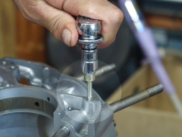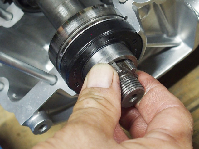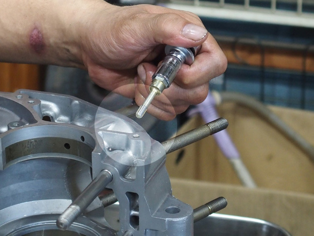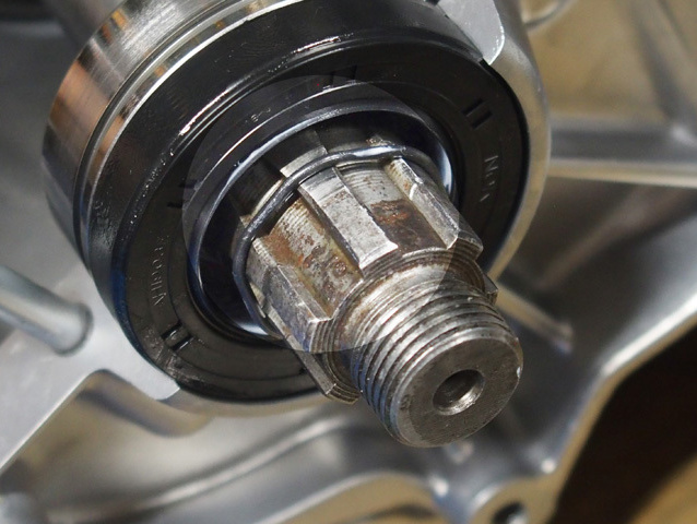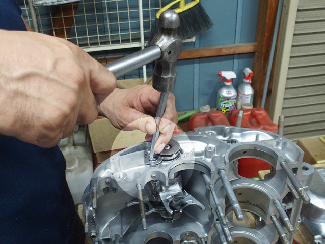 ナットは3回か4回に分けて締めますが、その度にクランクケースに挟まれているオイルシールが飛び出してきていないかチェック。飛び出してきているようであればプラハン等で叩いてオイルシールを押し込みます。