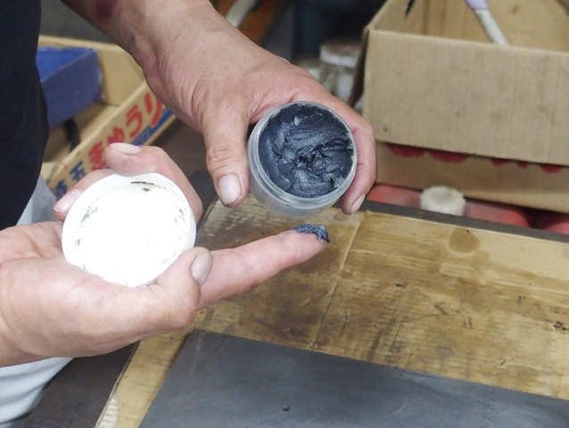 鉄板にオイルで溶いた研磨剤を塗ります。ちなみに弊社でこの作業に使用する鉄板は定期的にフライス盤で面研しています。