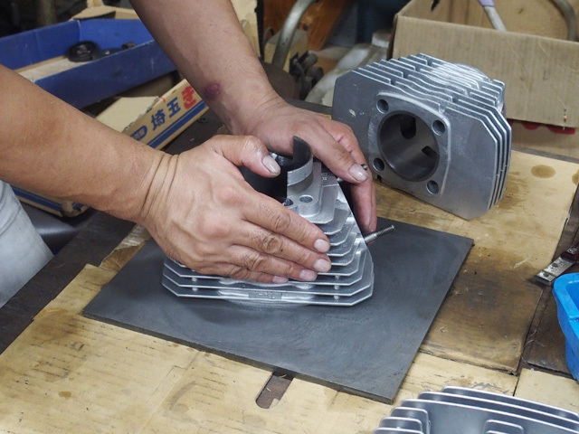 次は「シリンダー」「ヘッド」「ケースカバー」の洗浄です。まずは面出し。使うのは平面の出た鉄板と金属研磨剤(バルブコンパウンド等)。
