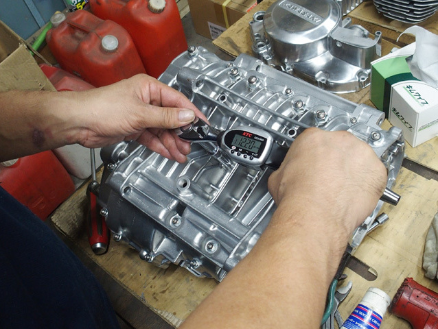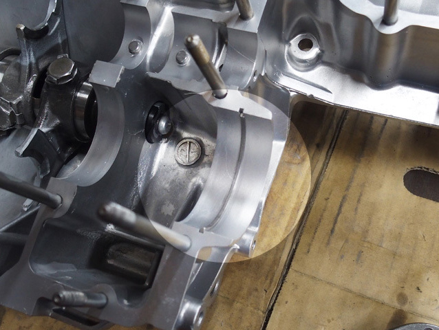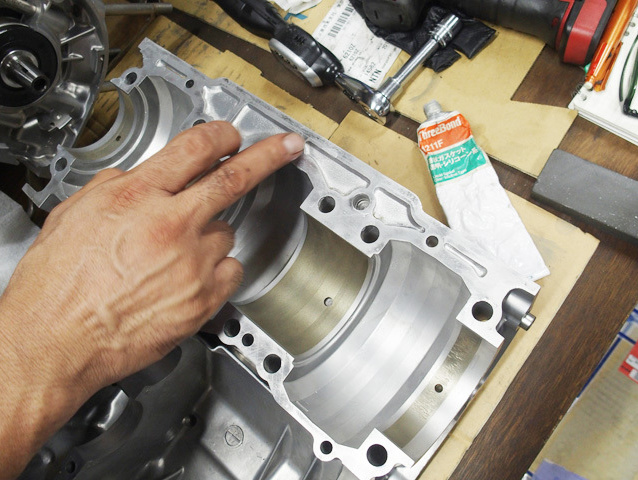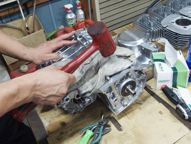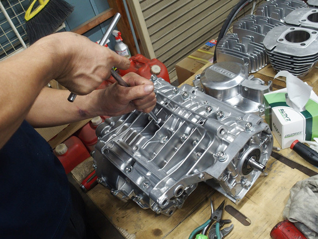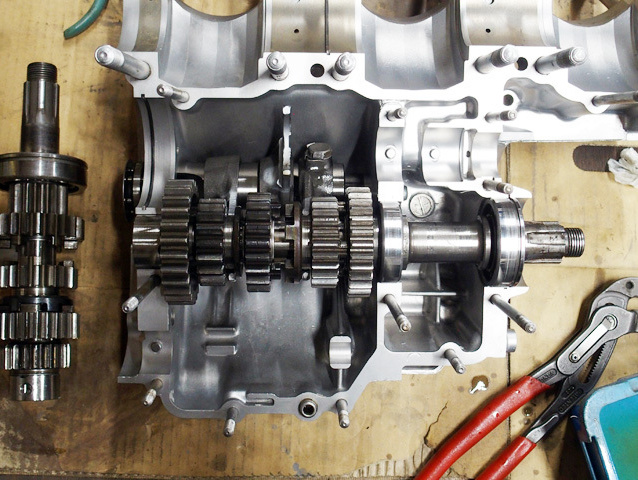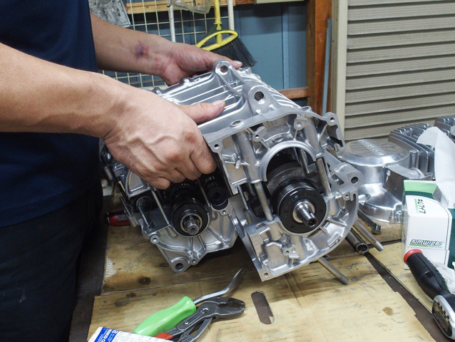 さ、いよいよ組付け作業です。大まかな流れはアッパーケースにリビルド済みのクランクシャフト及びミッションのギアシャフト類を組み込み、最後にロアケースをかぶせます。
