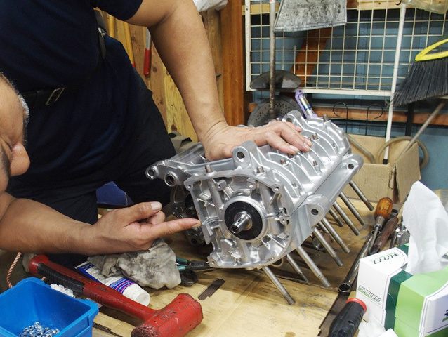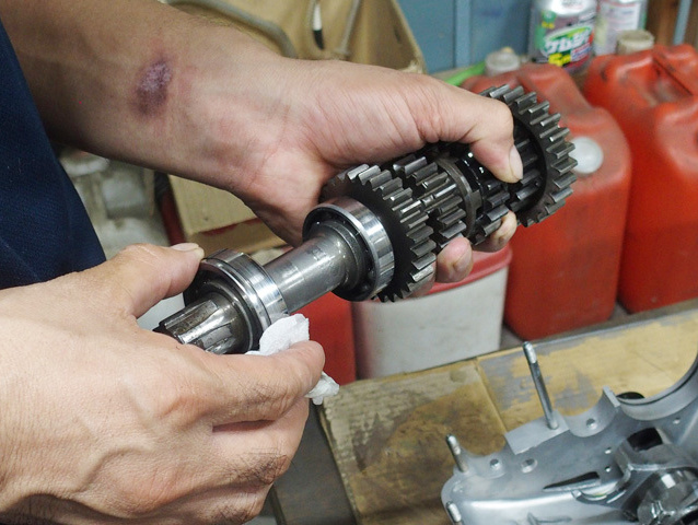 ミッションの「インプットシャフト」「アウトプットシャフト」に組み込まれている各ギアは、初期潤滑させて組み込みますが、各シャフトを支持しているベアリングのアウターレース外周は油分を拭き取ってから組み込みます。
