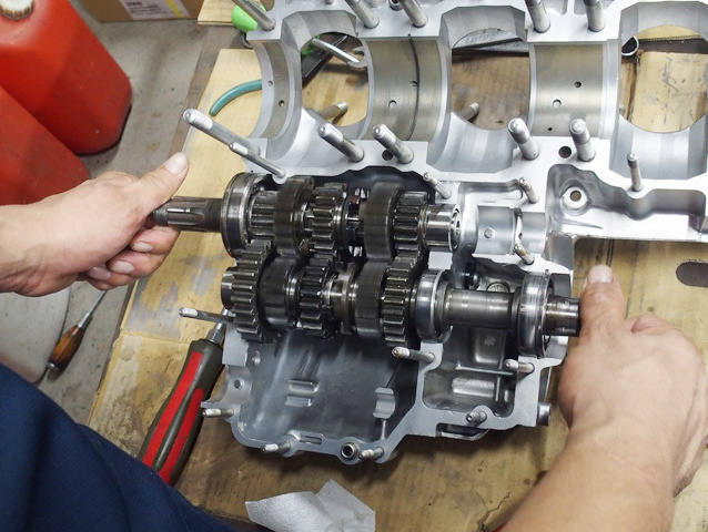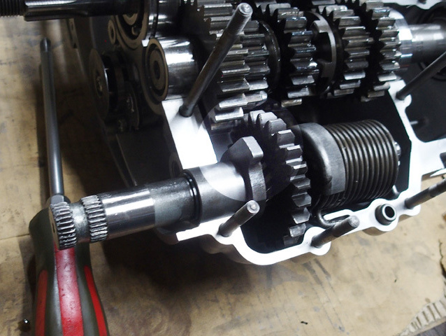上側が「インプットシャフト」下側が「アウトプットシャフト」。設置したら各シャフトの回転をチェック。シフトドラムを回転させてシフトフォークの動きも必ずチェックしましょう。この時点で回転が渋い時は「セットリング」と「ドエルピン」をチェック。それでも改善されない場合はミッションベアリングの圧入不良やミッションの各ギア間に組み込まれているシムの誤組や厚みの問題が考えられます。