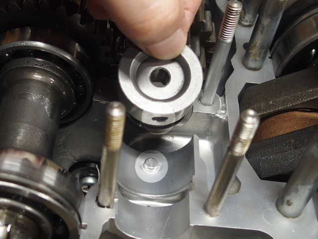 いよいよケース内の作業も最終段階です。液体パッキン等を使用していきますので手際よく作業を進めます。まずはプッシュロッドガイドの設置。ドエルピンと位置決めの穴に注意。