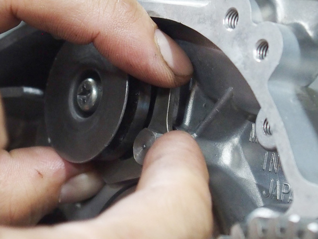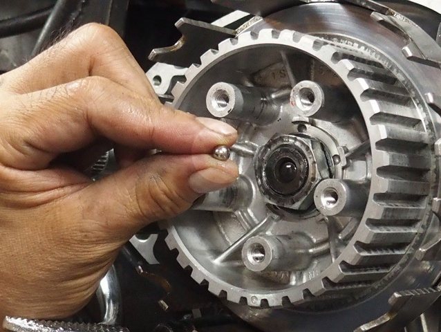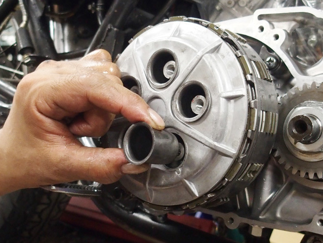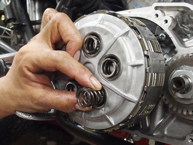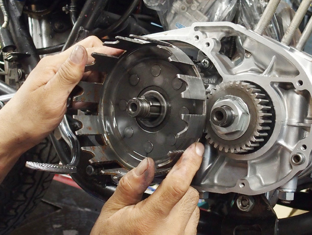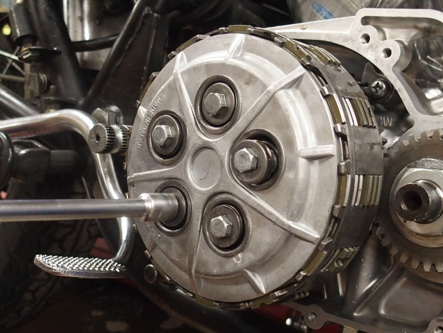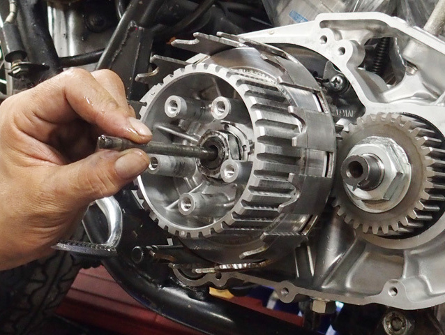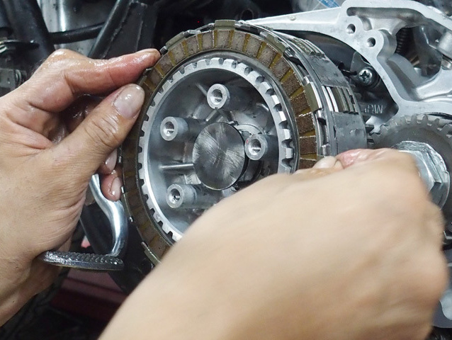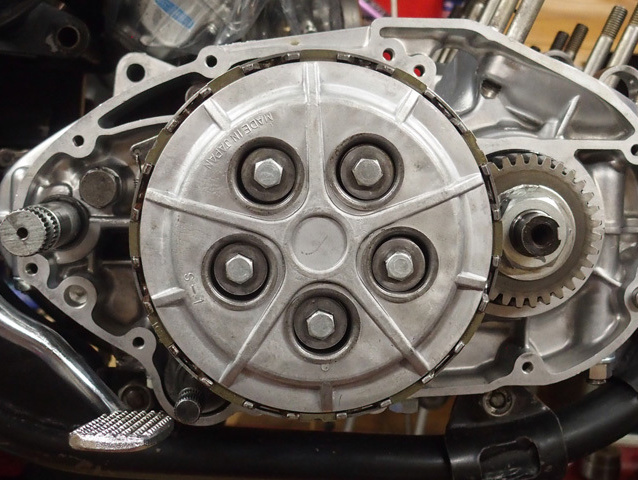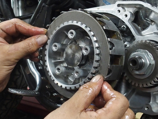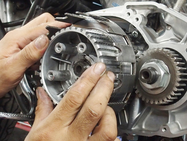 この時プレッシャープレートとクラッチインナーハウジングの噛み合わせが確実に合っているか、よく注意して組み付けます。
