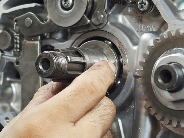 プライマリーギアは圧入にはなっていませんので手の力で十分に行える作業です。クランクシャフトの装着部やプライマリーギアの内側にかじり傷がある場合は修正又は交換してから組み付けましょう。ロックワッシャーは損傷が少ない場合は再利用でも構いません。