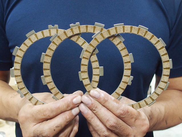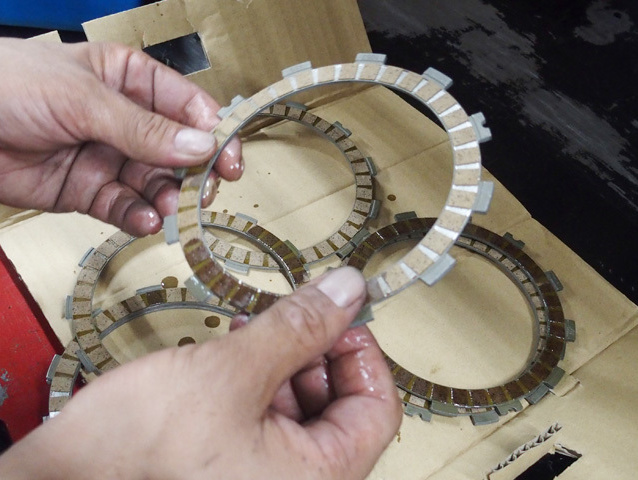 すべてのクラッチ板・クッションスプリング・スチールプレートにギアオイル(ミッションオイル)を塗布。特にフリクションプレートには十分オイルを染み込ませて下さい。