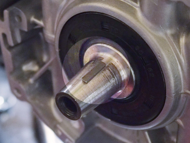 オイルレシーバーをアウトプットシャフトに取り付けます。このオイルレシーバーは内側の突起が折れ易いので、組み付けの際は突起の根本にクラックが入っていないかチェックしてから組み付けます。