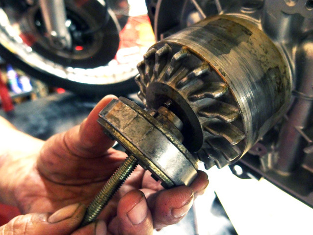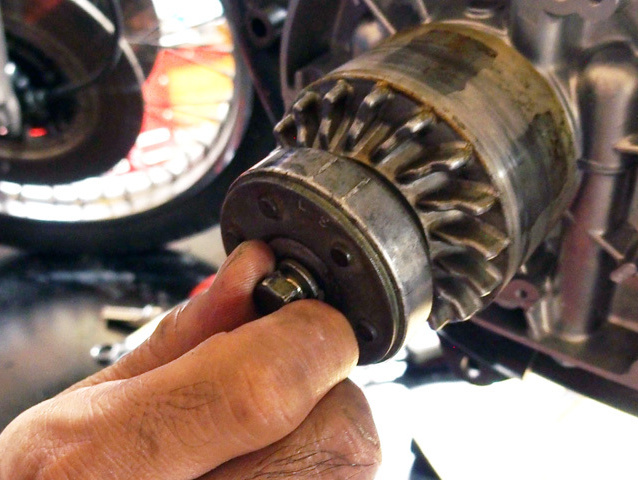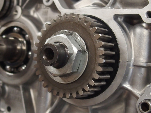 ハウジングの固定が終わった時点で、画像のようにクラッチハウジングのリングギアとクランクシャフトのプライマリーギアとの噛み合わせに適当なナットを噛み込ませ、回転をロックさせてプライマリーギアナットを規定トルクで締め付ける。