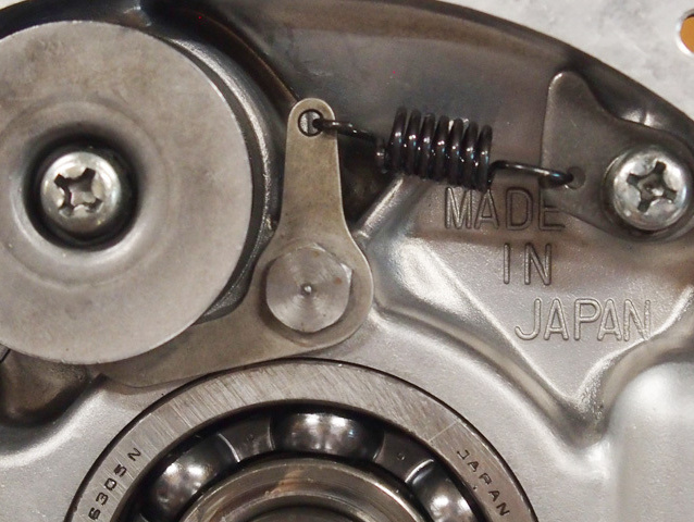 チェンジドラムレバーの組み付けです。このレバーはシフトチェンジ時の「節度感」を与えます。正常に作動しないと、シフトチェンジ時の誤作動や、爪先に違和感を感じるようになります